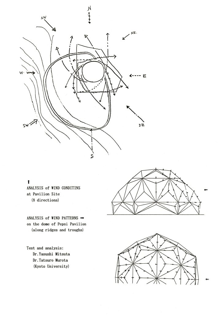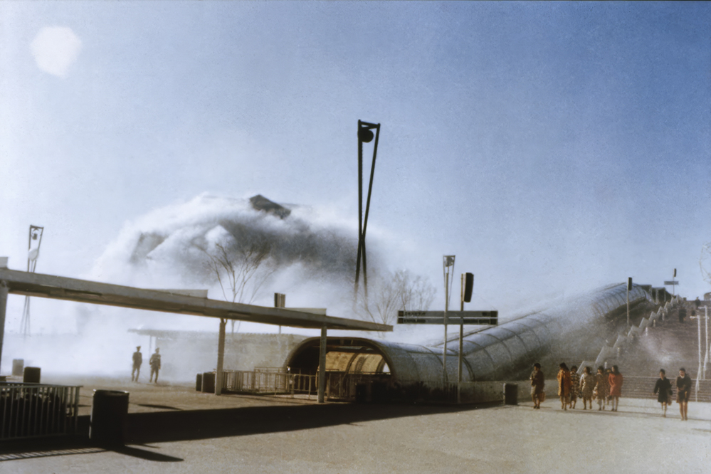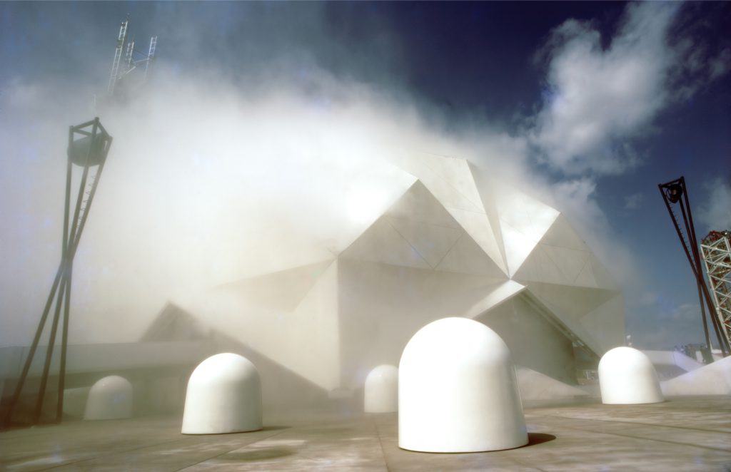 The dome (23mx50m in height and diameter) was shrouded in fog on calm days and adorned with ever-changing cloud on windy days. Pepsi Pavilion was the first atmospheric Fog Sculpture created by Fujiko Nakaya. Special fog nozzles producing fine water droplets comparable to natural fog in size were invented by cloud physicist Thomas Mee for this project. Currently, Mee Fog Nozzles are used extensively in special effects agriculture, and industries.