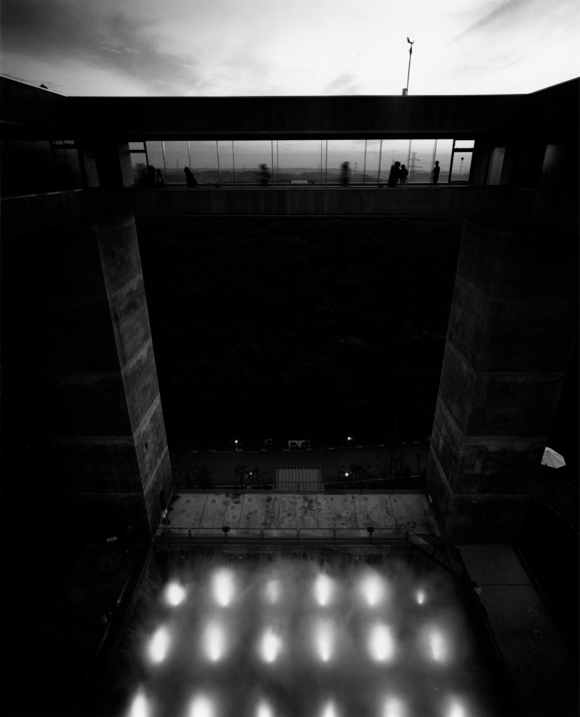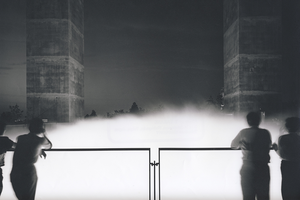The cubic structure of an observation deck rose 30m atop a hill. Its courtyard (20mx20mx5m) was filled with fog. The lighting was designed by Masao Nihei and the sound by Senji Mori. The ‘Performing Architecture’ was conceived by Shoei Yoh as an ‘apparatus for the physical experience of correspondence with nature’. Through the media of sky, trees, clouds, rain, rainbows, fog, light and sound, human beings and natural phenomena are thrust into dynamic interaction. (Observation Tower, Taikoyama Land)